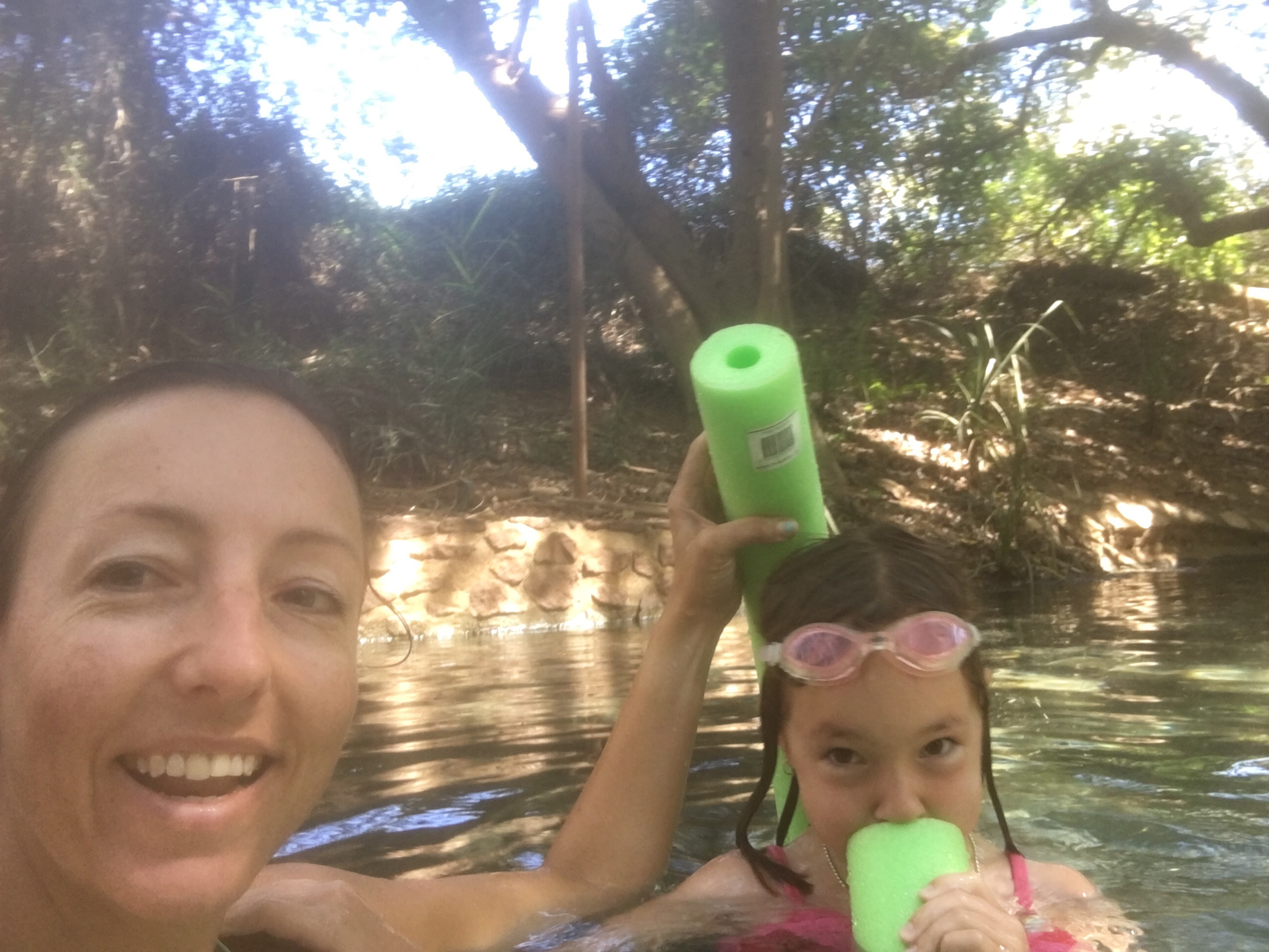 Miss6 and I decided to have a girls day out at the hot springs after dropping the car for its actual repair with Toyota (the first visit was to check what was needed). The springs were within walking distance of the caravan park so we headed there with our noodle and towels. The water was crystal clear and there were a number of pools to swim in so we walked around to check them all out first. People were filling up some of the lower pools so we thought we’d try there first as the current wasn’t too strong.