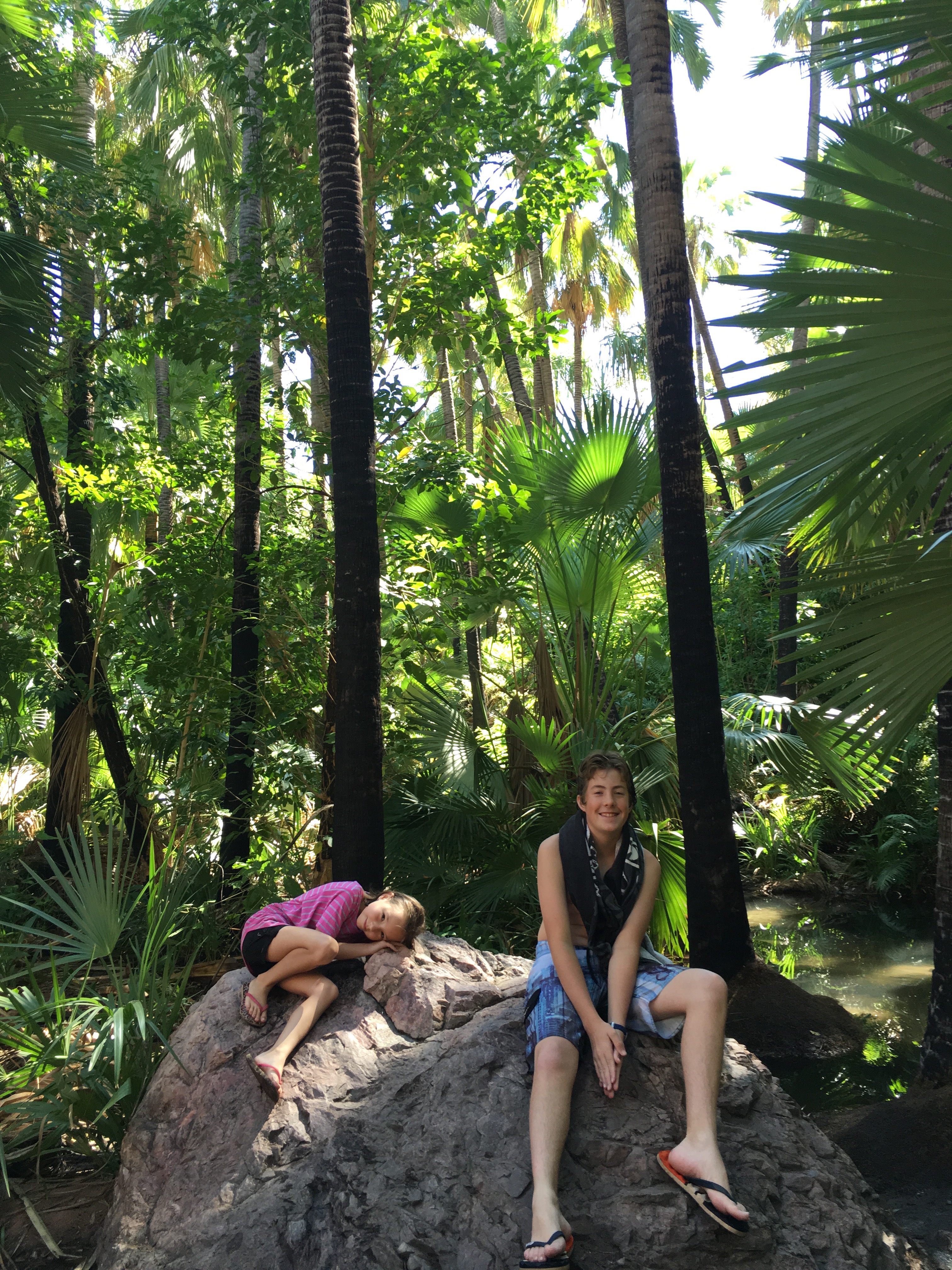 The water itself was a bit on the cool side and the sun wasn’t shining down into the gorge now that it was afternoon. Master14 braved the water and went for a swim while Miss6 and I walked slowly through the cool water only going so deep to enjoy the pool. We made our way to the thermal pond at the small waterfall behind a large rock and sat there in the warm water for a while. By the time we were ready to get out, the idea of going through that cold water again wasn’t appealing at all so we clamboured up over the large rock instead and avoided getting wet.