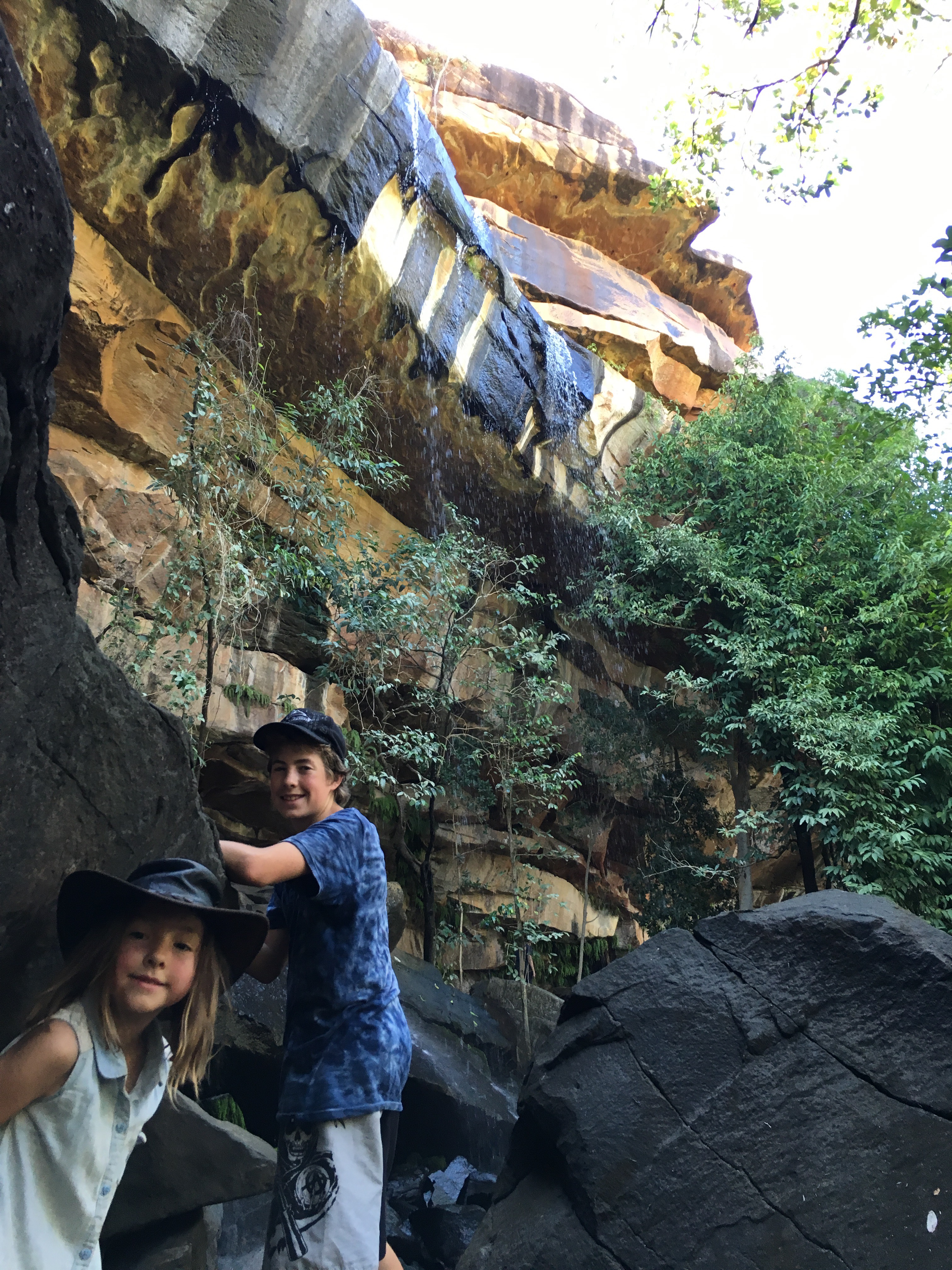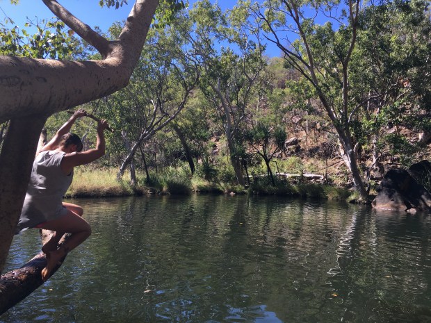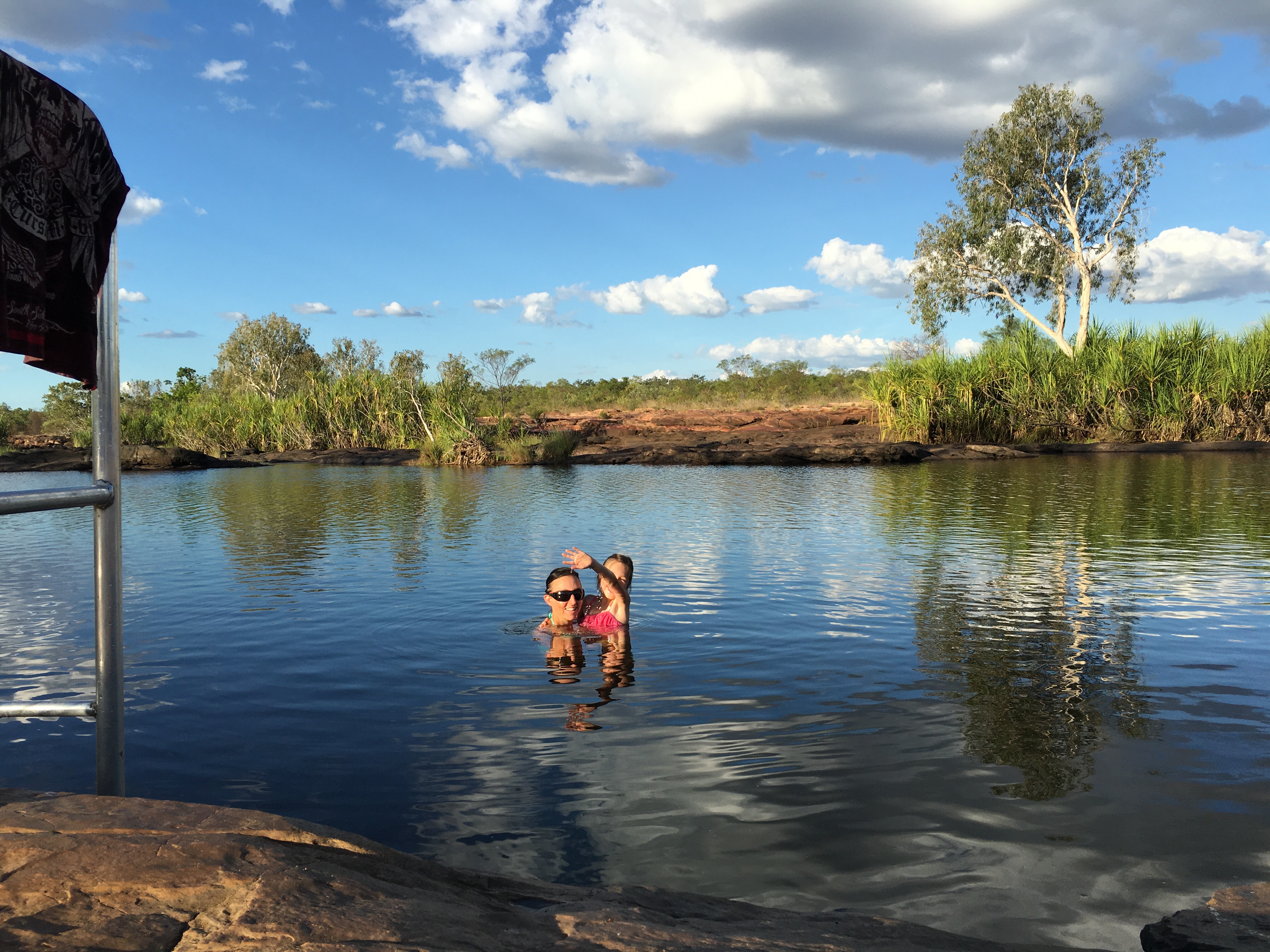 After a slight sleep in we headed to Emma Gorge via the little boat crossing and a lovely walk meandering over rocks and got there in an hour. Miss6 and I took some time to warm up before jumping in the water for a swim but Master14 was straight in there and jumping off the rocks at the waterfall soon enough. There were plenty of fish in the water and our camp neighbours had told us to bring bread to feed them so Miss6 was happy to do this while I had a little swim across to the falls.