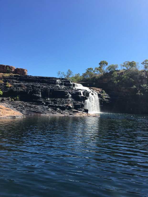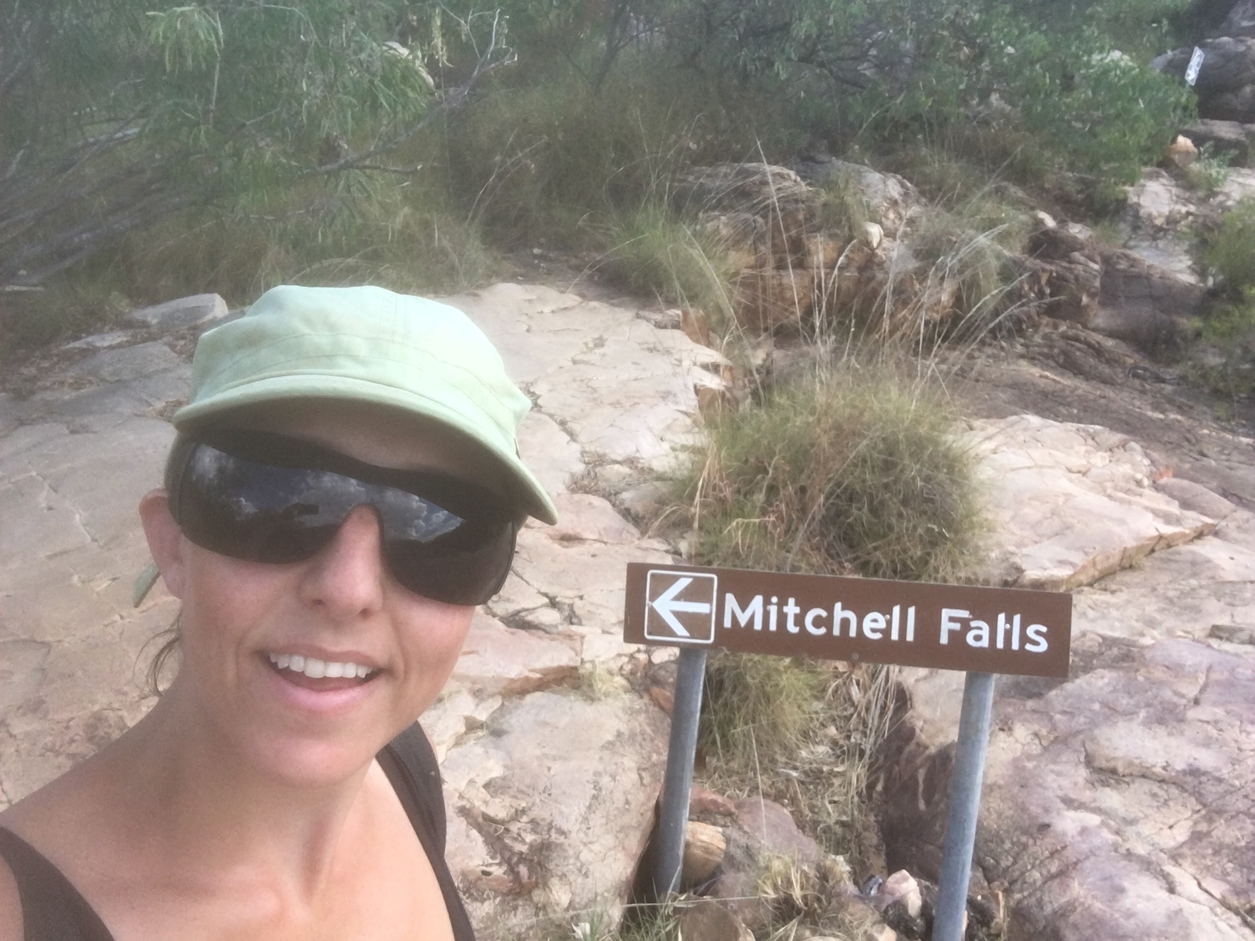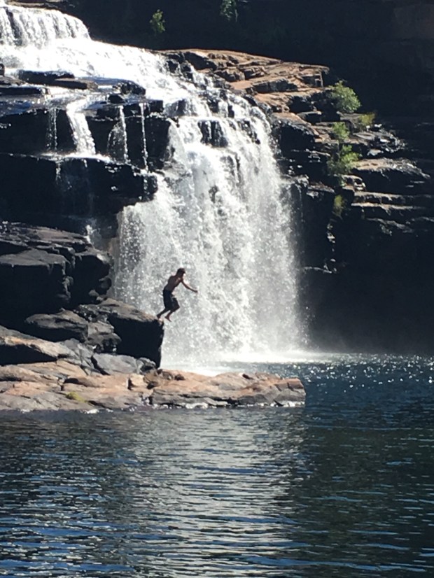 After enjoying our almost secluded swim we dried off in the sun and walked to the lookout to get our close up glimpse of Mitchell Falls. The view of the falls was breathtaking and pretty exciting to us to be so close. I did think of the two girls we’d chatted to at Drysdale Station who’d encouraged us to come here and felt grateful for their encouragement though I did wonder what they may have been smoking when they’d told us of the rainbow you could see in the water at the middle water fall – how you could see anything reflecting in that water from this distance was beyond even my vivid imagination.