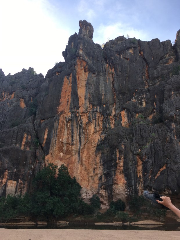 The kids decided not to do a second walk to Bell Gorge after brekky so we headed to Windjana Gorge to set up camp. We walked to the gorge after lunch and saw quite a large number of freshwater crocodiles just floating in the water. As we kept walking along the gorge the walls were interesting and remnant of being under the ocean millions of years ago. The walk along the gorge got a bit repititious after a while as there was no real destination or ‘look out’ to get to at the end so we turned around and headed back along the sand where we could get a closer look at the crocs and admire some Brolga’s along the way.