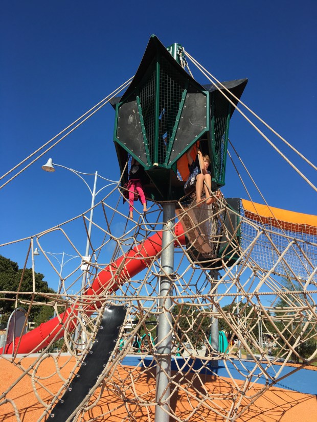 The kids and I walked down to the foreshore and spent most of the day playing on the amazing playgrounds down there. There was a big kids playground that had huge climbing equipment and a fun enclosed slide (even I had a go on that) and some interactive electronic games that got you moving and competing against each other. Master14 even played with his little sister on the younger playground, helping her go really fast on some of the equipment and showing her how to balance on the surfboard – it’s always so nice to see the two of them play well together considering their big age gap.